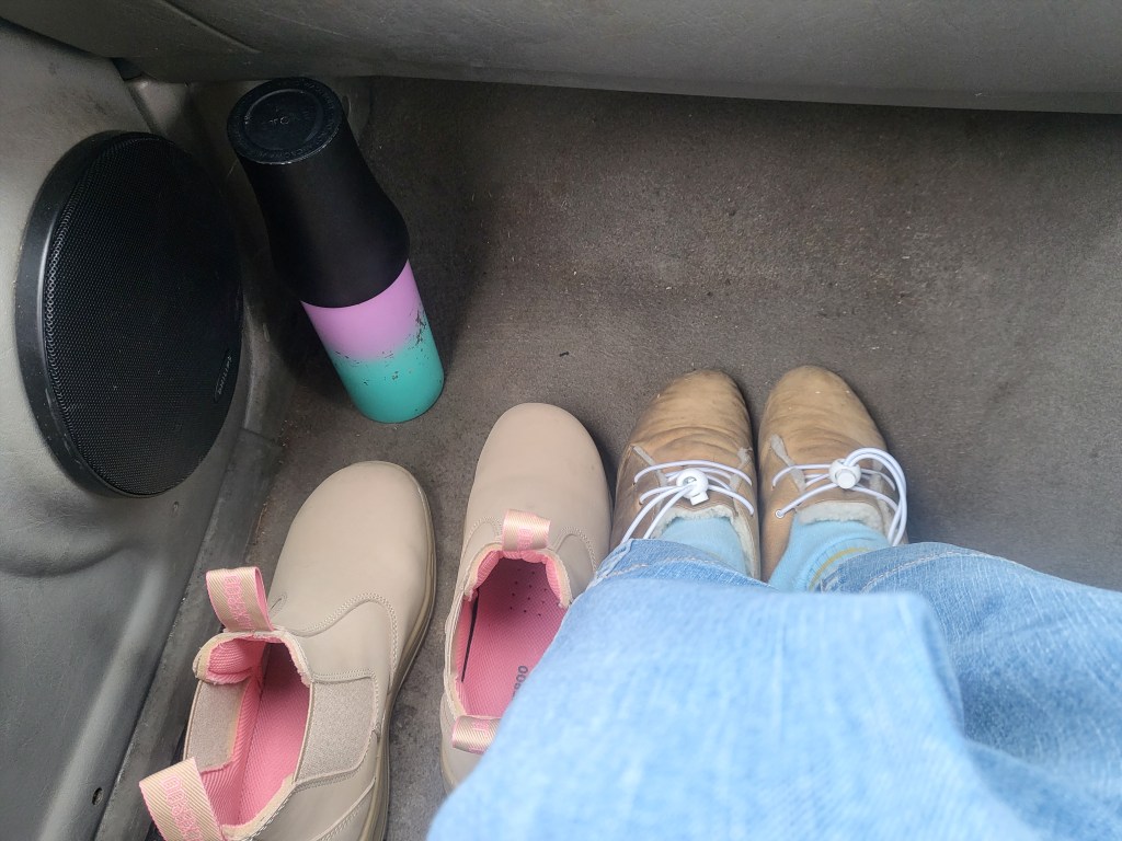 Ready for another days drive-essentials for the passenger seat. Slippers, boots for wee stops, thermos of tea.